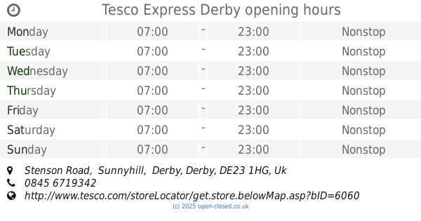 It is also possible to : Edit these OPENING HOURS of Store Tesco Express In Derby, Stenson Road, Sunnyhill, Derby,